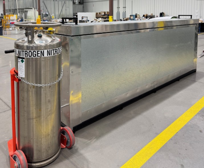 Vertical Aerospace's composite cryochamber (158" length x 15" width x 47" height) is a specialized processing system used to expose composite materials and structures to extremely low temperatures in a controlled environment. Its primary function is to enhance material performance, relieve residual stresses, and validate durability under cryogenic conditions similar to those experienced in high-altitude or space applications.